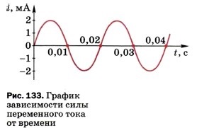 Стандартная частота переменного тока, применяемого в промышленности и осветительной сети в России и многих других странах, равна 50 Гц. Это означает, что на протяжении 1 с ток 50 раз течёт в одну сторону и 50 раз в другую. В некоторых странах (например, США) стандартная частота переменного тока равна 60 Гц. Сила тока, вырабатываемого генераторами переменного тока, меняется со временем по гармоническому закону (т. е. по закону синуса или косинуса). На рисунке 133 показан график изменения силы тока i со временем t.
