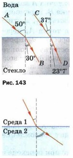 1. Какие из трёх величин — длина волны, частота и скорость распространения волны — изменятся при переходе волны из вакуума в алмаз? 2. Используя рисунок 143, докажите, что относительный показатель преломления n21 для данных двух сред не зависит от угла падения луча света. 3. Какая из двух сред (рис. 144) обладает большей оптической плотностью? В какой из них луч света распространяется с большей скоростью? Ответ обоснуйте. 4*. Используя уравнения (4) и (5), докажите, что У к а з а н и е: выразите из уравнения (5) скорость