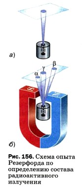 Поскольку радиоактивное излучение обладало необычными свойствами, многие учёные занялись его исследованием. Оказалось, что не только уран, но и некоторые другие химические элементы (например, радий) тоже самопроизвольно испускают радиоактивные лучи. Способность атомов некоторых химических элементов к самопроизвольному излучению стали называть радиоактивностью (от лат. radio — излучаю и activus — действенный). В 1899 г. в результате опыта, проведённого под руководством английского физика Эрнеста Резерфорда, было обнаружено, что радиоактивное излучение радия неоднородно, т. е. имеет сложный состав. Рассмотрим, как проводился этот опыт. На рисунке 156, (а) изображён толстостенный свинцовый сосуд с крупицей радия на дне. Пучок радиоактивного излучения радия выходит сквозь узкое отверстие и попадает на фотопластинку (излучение радия происходит во все стороны, но сквозь толстый слой свинца оно пройти не может). После проявления фотопластинки на ней обнаруживалось одно тёмное пятно — как раз в том месте, куда попадал пучок.