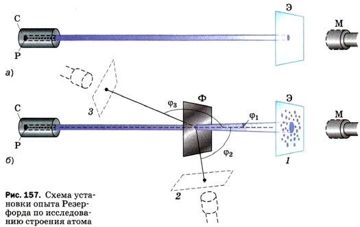 Чтобы понять, как проводились эти опыты, рассмотрим рисунок 157. В опытах использовался свинцовый сосуд С с радиоактивным веществом Р, излучающим α-частицы. Из этого сосуда α-частицы вылетают через узкий канал со скоростью порядка 15 000 км/с. Поскольку α-частицы непосредственно увидеть невозможно, то для их обнаружения служит стеклянный экран Э. Экран покрыт тонким слоем специального вещества, благодаря чему в местах попадания в экран α-частиц возникают вспышки, которые наблюдаются с помощью микроскопа М. Такой метод регистрации частиц называется методом сцинтилляций (т. е. вспышек). Вся эта установка помещается в сосуд, из которого откачан воздух (чтобы устранить рассеяние α-частиц за счёт их столкновений с молекулами воздуха). Если на пути α-частиц нет никаких препятствий, то они падают на экран узким, слегка расширяющимся пучком (рис. 157, а). При этом все возникающие на экране вспышки сливаются в одно небольшое световое пятно. Если же на пути α-частиц поместить тонкую фольгу Ф из исследуемого металла (рис. 157, б), то при взаимодействии с веществом α-частицы рассеиваются по всем направлениям на разные углы ср (на рисунке изображены только три угла: φ1, φ2 и φ3). Когда экран находится в положении 1, наибольшее количество вспышек расположено в центре экрана. Значит, основная часть всех а-частиц прошла сквозь фольгу, почти не изменив первоначального направления (рассеялась на малые углы). При удалении от центра экрана количество вспышек становится меньше. Следовательно, с увеличением угла рассеяния Ф количество рассеянных на эти углы частиц резко уменьшается. Перемещая экран вместе с микроскопом вокруг фольги, можно обнаружить, что некоторое (очень небольшое) число частиц рассеялось на углы, близкие к 90° (это положение экрана обозначено цифрой 2), а некоторые единичные частицы — на углы порядка 180°, т. е. в результате взаимодействия с фольгой были отброшены назад (положение 3). Именно эти случаи рассеяния α-частиц на большие углы дали Резерфорду наиболее важную информацию для понимания того, как устроены атомы веществ. Проанализировав результаты опытов, Резерфорд пришёл к выводу, что столь сильное отклонение α-частиц возможно только в том случае, если внутри атома имеется чрезвычайно сильное электрическое поле. Такое поле могло быть создано зарядом, сконцентрированным в очень малом объёме (по сравнению с объёмом атома).