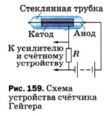 Глава 4. Строение атома и атомного ядра. Использование энергии атомных ядер § 54. Экспериментальные методы исследования частицДля дальнейшего развития ядерной физики (в частности, для исследования строения атомных ядер) необходимы были специальные устройства, с помощью которых можно было бы регистрировать ядра и различные частицы, а также изучать их взаимодействия. Один из известных вам методов регистрации частиц — метод сцинтилляций — не даёт необходимой точности, так как результат подсчёта вспышек на экране в большой степени зависит от остроты зрения наблюдателя. Кроме того, длительное наблюдение оказывается невозможным, так как глаз быстро устаёт. Более совершенным прибором для регистрации частиц является так называемый счётчик Гейгера, изобретённый в 1908 г. немецким физиком Гансом Гейгером. Для рассмотрения устройства и принципа действия этого прибора обратимся к рисунку 159. Счётчик Гейгера состоит из металлического цилиндра, являющегося катодом (т. е. отрицательно заряженным электродом), и натянутой вдоль его оси тонкой проволочки — анода (т. е. положительного электрода). Катод и анод через сопротивление R присоединены к источнику высокого напряжения (порядка 200—1000 В), благодаря чему в пространстве между электродами возникает сильное электрическое поле. Оба электрода помещают в герметичную стеклянную трубку, заполненную разреженным газом (обычно аргоном).