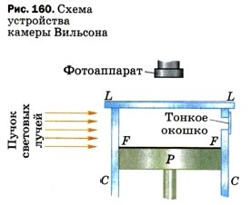 Счётчик позволяет только регистрировать тот факт, что через него пролетает частица. Гораздо бо́льшие возможности для изучения микромира даёт прибор, изобретённый шотландским физиком Чарлзом Вильсоном в 1912 г. и называемый камера Вильсона. Камера Вильсона (рис. 160) состоит из невысокого стеклянного цилиндра СС со стеклянной крышкой LL (на рисунке цилиндр показан в разрезе). Внутри цилиндра может двигаться поршень Р. На дне камеры находится чёрная ткань FF. Благодаря тому что ткань увлажнена смесью воды с этиловым спиртом, воздух в камере насыщен парами этих жидкостей. При быстром движении поршня вниз находящиеся в камере воздух и пары́ жидкостей расширяются, их внутренняя энергия уменьшается, температура понижается. В обычных условиях это вызвало бы конденсацию паров (появление тумана). Однако в камере Вильсона этого не происходит, так как из неё предварительно удаляются так называемые ядра конденсации (пылинки, ионы и пр.). Поэтому в данном случае при понижении температуры в камере пары́ жидкостей становятся пересыщенными, т. е. переходят в крайне неустойчивое состояние, при котором они будут легко конденсироваться на любых образующихся в камере ядрах конденсации, например на ионах. Изучаемые частицы впускаются в камеру через тонкое окошко (иногда источник частиц помещают внутри камеры). Пролетая с большой скоростью через газ, частицы создают на своём пути ионы. Эти ионы и становятся ядрами конденсации, на которых пары жидкостей конденсируются в виде маленьких капелек (водяной пар конденсируется преимущественно на отрицательных ионах, пары этилового спирта — на положительных). Вдоль всего пути частицы возникает тонкий след из капелек (трек), благодаря чему её траектория движения становится видимой. Если поместить камеру Вильсона в магнитное поле, то траектории заряженных частиц искривляются. По направлению изгиба следа можно судить о знаке заряда частицы, а по радиусу кривизны определять её массу, энергию, заряд. Треки существуют в камере недолго, так как воздух нагревается, получая тепло от стенок камеры, и капельки испаряются. Чтобы получить новые следы, необходимо удалить имеющиеся ионы с помощью электрического поля, сжать воздух поршнем, выждать, пока воздух в камере, нагревшийся при сжатии, охладится, и произвести новое расширение. Обычно треки частиц в камере Вильсона не только наблюдают, но и фотографируют. При этом камеру освещают сбоку мощным пучком световых лучей, как показано на рисунке 160. С помощью камеры Вильсона был сделан ряд важнейших открытий в области ядерной физики и физики элементарных частиц. Одной из разновидностей камеры Вильсона является изобретённая в 1952 г. пузырьковая камера. Она действует примерно по тому же принципу, что и камера Вильсона, но вместо пересыщенного пара в ней используется перегретая выше точки кипения жидкость (например, жидкий водород). При движении в этой жидкости заряженной частицы вдоль её траектории образуется ряд пузырьков пара. Пузырьковая камера обладает большим быстродействием по сравнению с камерой Вильсона. Вопросы1. По рисунку 159 расскажите об устройстве и принципе действия счётчика Гейгера.