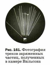 На рисунке видны расходящиеся веером прямые. Это следы α-частиц, которые пролетели сквозь пространство камеры, не испытав соударений с ядрами атомов азота. Но след одной α-частицы раздваивается, образуя так называемую «вилку». Это означает, что в точке раздвоения трека произошло взаимодействие α-частицы с ядром атома азота, в результате чего образовались ядра атомов кислорода и водорода. То, что образуются именно эти ядра, было выяснено по характеру искривления треков при помещении камеры Вильсона в магнитное поле. Реакцию взаимодействия ядра азота с α-частицами с образованием ядер кислорода и водорода записывают так: