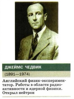где символом В дальнейшем было исследовано взаимодействие α-частиц с ядрами атомов других элементов: бора (В), натрия (Na), алюминия (Аl), магния (Mg) и многих других. В результате выяснилось, что из всех этих ядер α-частицы выбивали протоны. Это давало основания полагать, что протоны входят в состав ядер атомов всех химических элементов. Открытие протона не давало полного ответа на вопрос о том, из каких частиц состоят ядра атомов. Если считать, что атомные ядра состоят только из протонов, то возникает противоречие. Покажем на примере ядра атома бериллия Допустим, что ядро Но если бы ядро бериллия действительно состояло только из четырёх протонов, то его масса была бы приблизительно равна 4 а. е. м. (так как масса каждого протона приблизительно равна 1 а. е. м.).