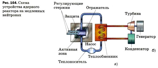 Активная зона окружена слоем вещества, отражающего нейтроны (отражатель), и защитной оболочкой из бетона, задерживающей нейтроны и другие частицы. Для управления реакцией служат регулирующие стержни, эффективно поглощающие нейтроны. При их полном погружении в активную зону цепная реакция идти не может. Для запуска реактора регулирующие стержни постепенно выводят из активной зоны до тех пор, пока не начнётся цепная реакция деления ядер урана. Образующиеся в процессе этой реакции нейтроны и осколки ядер, разлетаясь с большой скоростью, попадают в воду, сталкиваются с ядрами атомов кислорода и водорода, отдают им часть своей кинетической энергии и замедляются. Вода при этом нагревается, а замедленные нейтроны через какое-то время опять попадают в урановые стержни и участвуют в делении ядер. Активная зона реактора посредством труб соединяется с теплообменником, образуя так называемый первый замкнутый контур. Насосы обеспечивают циркуляцию воды в этом контуре. При этом вода, нагретая в активной зоне за счёт внутренней энергии атомных ядер, проходя через теплообменник, нагревает воду в змеевике второго контура, превращая её в пар. Таким образом, вода в активной зоне реактора служит не только замедлителем нейтронов, но и теплоносителем, отводящим тепло. На рисунке 164, (б) схематично показаны устройства, в которых энергия пара, образовавшегося в змеевике, преобразуется в электрическую энергию. Посредством этого пара вращается турбина, которая, в свою очередь, приводит во вращение ротор генератора электрического тока. Отработанный пар поступает в конденсатор и превращается в воду. Затем весь цикл повторяется. Таким образом, при получении электрического тока на атомных электростанциях происходят следующие преобразования энергии: часть внутренней энергии атомных ядер урана → кинетическая энергия нейтронов и осколков ядер → внутренняя энергия воды → внутренняя энергия пара → кинетическая энергия пара → кинетическая энергия ротора турбины и ротора генератора → электрическая энергия. Вопросы1. Что такое ядерный реактор? Назовите основные части реактора. Что находится в его активной зоне?