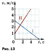 4. В одних и тех же координатных осях постройте графики проекции вектора скорости (на ось X, сонаправленную с вектором начальной скорости) при прямолинейном равноускоренном движении для случаев: а) 5. На рисунке 13 представлены графики зависимости модуля вектора скорости от времени при прямо- линейном движении двух тел. С каким по модулю ускорением движется тело I; тело II?