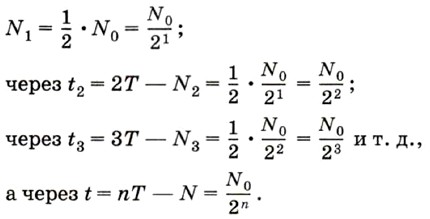 Выведем зависимость числа N радиоактивных атомов от времени t и периода полураспада Т. Время будем отсчитывать от момента начала наблюдения t0 = 0, когда число радиоактивных атомов в источнике излучения было равно N0. Тогда через промежуток времени t1 = Т число радиоактивных атомов будет
