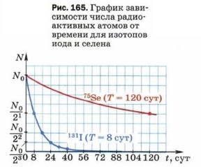 Эквивалентная доза может измеряться в тех же единицах, что и поглощённая, однако для её измерения существуют и специальные единицы. В СИ единицей эквивалентной дозы является зи́верт (Зв). Применяются также дольные единицы: миллизиверт (мЗв), микрозиверт (мкЗв) и др. Из этой формулы следует, что для рентгеновского, γ- и β-излучений (для которых К = 1) 1 Зв соответствует поглощённой дозе в 1 Гр, а для всех остальных видов излучения — дозе в 1 Гр, умноженной на соответствующий данному излучению коэффициент качества. При оценке воздействий ионизирующих излучений на живой организм учитывают и то, что одни части тела (органы, ткани) более чувствительны, чем другие. Например, при одинаковой эквивалентной дозе возникновение рака в лёгких более вероятно, чем в щитовидной железе. Другими словами, каждый орган и ткань имеют определённый коэффициент радиационного риска (для лёгких, например, он равен 0,12, а для щитовидной железы — 0,03). Поглощённая и эквивалентная дозы зависят и от времени облучения (т. е. от времени взаимодействия излучения со средой). При прочих равных условиях эти дозы тем больше, чем больше время облучения, т. е. дозы накапливаются со временем. При оценке степени опасности, которую радиоактивные изотопы представляют для живых существ, важно учитывать и то, что число радиоактивных (т. е. ещё не распавшихся) атомов в веществе уменьшается с течением времени. При этом пропорционально уменьшается число радиоактивных распадов в единицу времени и излучаемая энергия. Энергия, как вы уже знаете, является одним из факторов, определяющих степень отрицательного воздействия излучения на человека. Поэтому так важно найти количественную зависимость (т. е. формулу), по которой можно было бы рассчитать, сколько радиоактивных атомов остаётся в веществе к любому заданному моменту времени. Для вывода этой зависимости необходимо знать, что скорость уменьшения количества радиоактивных ядер у разных веществ различна и зависит от физической величины, называемой периодом полураспада.