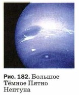 Измерения «Вояджера-2» позволили обнаружить у Урана весьма специфическое магнитное поле, которое направлено не из геометрического центра планеты, а наклонено на 59° относительно оси вращения. Из-за асимметричности магнитного поля значения магнитной индукции на поверхности в южном и северном полушариях различны. Магнитное поле превосходит земное в 50 раз. Кроме Урана, аналогичное смещённое магнитное поле наблюдается у Нептуна. Возможно, такая конфигурация поля характерна для «ледяных гигантов» и обусловлена тем, что поле у них формируется на довольно малых глубинах. Нептун. «Вояджер-2» был первым космическим кораблём, который в 1989 г. достиг Нептуна. Он сфотографировал планету, и благодаря этим изображениям было обнаружено, что у планеты есть пять колец (рис. 181). Видимая поверхность Нептуна представляет собой плотный облачный слой синего цвета с полосами и белыми и тёмными пятнами. Большое Тёмное Пятно (рис. 182) является самым крупным из наблюдавшихся до сих пор ураганов-антициклонов.