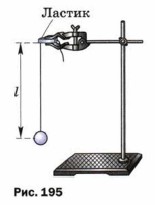 1. Соберите установку по рисунку 195. При этом длина маятника должна быть равна 5 см, как указано в таблице 5 для первого опыта. Длину 2. Для проведения первого опыта отклоните шарик от положения равновесия на небольшую амплитуду (1—2 см) и отпустите. Измерьте промежуток времени t, за который маятник совершит 30 полных колебаний. Результаты измерений запишите в таблицу 5.