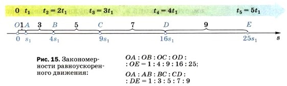 Из этого рисунка видно, что ОА : ОВ : ОС : OD : ОЕ = 1 : 4 : 9 : 16 : 25, (1) т. е. при увеличении промежутков времени, отсчитываемых от начала движения, в целое число раз по сравнению с t1 модули соответствующих векторов перемещений возрастают как ряд квадратов последовательных натуральных чисел. Из рисунка 15 видна ещё одна закономерность: ОА : АВ : ВС : CD : DE = 1 : 3 : 5 : 7 : 9, (2) т. е. модули векторов перемещений, совершаемых телом за последовательные равные промежутки времени (каждый из которых равен t1), относятся как ряд последовательных нечётных чисел.