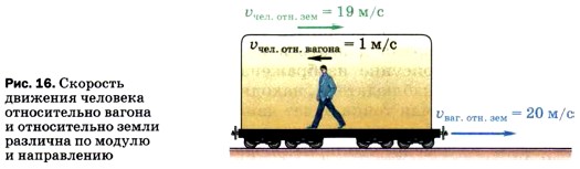 Человек идёт по вагону против движения поезда (рис. 16). Скорость поезда относительно поверхности земли равна 20 м/с, а скорость человека относительно вагона равна 1 м/с. Определим, с какой скоростью и в каком направлении движется человек относительно поверхности земли. Будем рассуждать так. Если бы человек не шёл по вагону, то за 1 с он переместился бы вместе с поездом на расстояние, равное 20 м. Но за это же время он прошёл расстояние, равное 1 м, против хода поезда. Поэтому за время, равное 1 с, он сместился относительно поверхности земли только на 19 м в направлении движения поезда. Значит, скорость человека относительно поверхности земли равна 19 м/с и направлена в ту же сторону, что и скорость поезда. Таким образом, в системе отсчёта, связанной с поездом, человек движется со скоростью 1 м/с, а в системе отсчёта, связанной с каким-либо телом на поверхности земли, — со скоростью 19 м/с, причём направлены эти скорости в противоположные стороны. Отсюда следует, что скорость относительна, т. е. скорость одного и того же тела в разных системах отсчёта может быть различной как по числовому значению, так и по направлению.