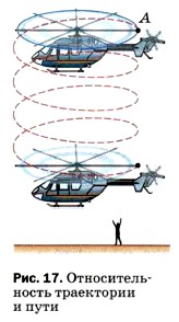Теперь обратимся к другому примеру. Представьте вертолёт, вертикально опускающийся на землю. Относительно вертолёта любая точка винта, например точка А (рис. 17), будет всё время двигаться по окружности, которая на рисунке изображена сплошной линией. Для наблюдателя, находящегося на земле, та же самая точка будет двигаться по винтовой траектории (штриховая линия). Из этого примера ясно, что траектория движения тоже относительна, т. е. траектория движения одного и того же тела может быть различной в разных системах отсчёта. Следовательно, путь является величиной относительной, так как он равен сумме длин всех участков траектории, пройденных телом за рассматриваемый промежуток времени. Это особенно наглядно проявляется в тех случаях, когда физическое тело движется в одной системе отсчёта и покоится в другой. Например, человек, сидящий в движущемся поезде, проходит определённый путь s в системе, связанной с землёй, а в системе отсчёта, связанной с поездом, его путь равен нулю.