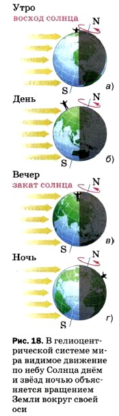 Понимание того, что движение одного и того же тела можно рассматривать в разных системах отсчёта, сыграло огромную роль в развитии взглядов на строение Вселенной. С давних пор люди замечали, что звёзды в течение ночи, так же как и Солнце днём, перемещаются по небу с востока на запад, двигаясь по дугам и делая за сутки полный оборот вокруг Земли. Поэтому в течение многих столетий считалось, что в центре мира находится неподвижная Земля, а вокруг неё обращаются все небесные тела. Такая система мира была названа геоцентрической (греческое слово «гео» означает «земля»).