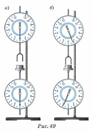 Ударив по столу рукой, можно ощутить взаимодействие тел. При этом рука действует на стол с некоторой силой, а возникающее болезненное ощущение свидетельствует о том, что и со стороны стола на руку также действовала некоторая сила. 2. Выясним, как соотносятся между собой силы, с которыми действуют друг на друга взаимодействующие тела. Для этого закрепим в штативе один над другим два демонстрационных динамометра (рис. 49, а). К верхнему динамометру подвесим магнит, а на столик нижнего динамометра положим стальной брусок. Установим стрелки динамометров на нуль. Приблизим магнит к бруску (рис. 49, б). Мы увидим, что стрелки динамометров отклонятся от нуля.