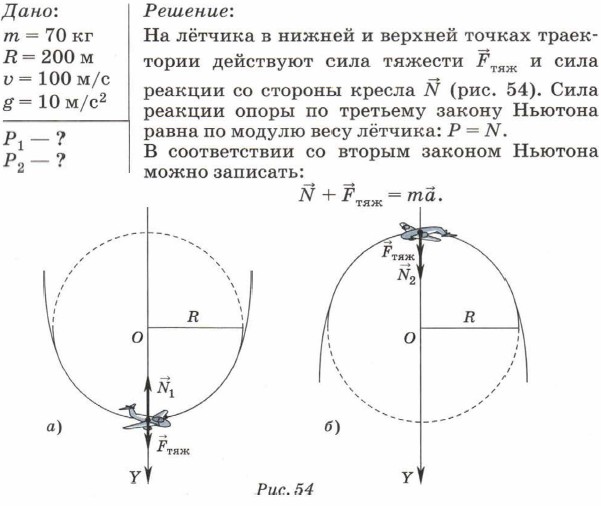 Для нижней точки траектории это уравнение в проекциях на ось OY (рис. 54, а) будет иметь вид: -N1 + Fтяж = -mа, или N1 - mg = mа. Следовательно, Р1 = N1 = mа + mg = m(а + g). Для верхней точки траектории (рис. 54, б) можно записать: N2 + Fтяж = mа.