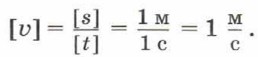 Единица скорости в СИ — метр в секунду (1 м/с). Эту единицу можно получить, разделив единицу перемещения на единицу времени: