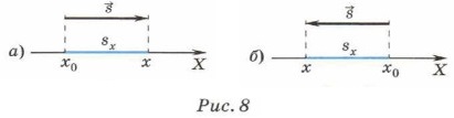 Если начальная координата тела х0 = 0, то х = υxt. Таким образом, координату тела при равномерном прямолинейном движении в любой момент времени можно определить, если известны его начальная координата и проекция скорости движения на ось X. Проекции скорости и перемещения могут быть как положительными, так и отрицательными. Проекция скорости положительна, если направление движения совпадает с направлением оси X (см. рис. 8, а). В этом случае х > х0. Проекция скорости отрицательна, если тело движется против направления оси X (рис. 8, б). В этом случае х < х0.