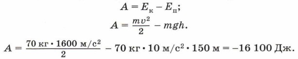 Глава 1. Законы механики § 23. Закон сохранения механической энергии (окончание)2. Парашютист массой 70 кг отделился от неподвижно висящего вертолёта и, пролетев 150 м до раскрытия парашюта, приобрёл скорость 40 м/с. Чему равна работа силы сопротивления воздуха?