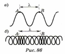 Можно также сказать, что длина волны — это расстояние между двумя ближайшими горбами или впадинами поперечной волны (рис. 86, а) или расстояние между двумя ближайшими сгущениями или разрежениями продольной волны (рис. 86, б).