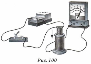Ток, возникающий в цепи, называют индукционным током (в переводе с латинского — «наведённый»). 3. Несколько изменим опыт и, оставив неподвижным магнит, будем перемещать катушку относительно магнита. Результат останется неизменным: при движении катушки изменяется пронизывающее её магнитное поле, и в цепи возникает индукционный ток. Заменим полосовой магнит электромагнитом, обмотка которого соединена с источником тока (рис. 100). При перемещении электромагнита в катушке гальванометр зафиксирует появление в ней индукционного тока. Если теперь с помощью ключа замыкать и размыкать цепь электромагнита, оставив его неподвижным в катушке, то в ней в эти моменты также будет возникать индукционный ток.