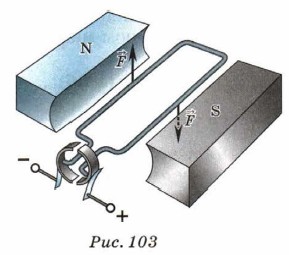 Вопросы для самопроверки 1. Что такое магнитный поток? От каких физических величин зависит значение магнитного потока? 2. По какой формуле может быть вычислен магнитный поток, пронизывающий контур, расположенный перпендикулярно вектору магнитной индукции однородного магнитного поля? 3. Что принято за единицу магнитного потока? 4. Объясните, почему происходит изменение магнитного потока при внесении постоянного магнита в катушку. 5. В чём состоит принципиальное отличие генератора постоянного тока от двигателя постоянного тока? 6. Объясните принцип действия генератора постоянного тока. Задание 29 1. Как изменится магнитный поток, пронизывающий контур, помещённый в однородное магнитное поле перпендикулярно линиям магнитной индукции, если контур повернуть, как показано на рисунке 103? 2. Чему равен магнитный поток в том случае, когда плоскость контура расположена вдоль линий магнитной индукции? 3. Как изменится магнитный поток, пронизывающий контур, если модуль вектора магнитной индукции увеличится в 2 раза, а площадь поверхности контура уменьшится в 2 раза? 4. Чему равна магнитная индукция однородного магнитного поля, в которое поместили проводящий контур площадью 50 см2? Магнитный поток, пронизывающий контур, равен 0,1 мВб. Контур расположен перпендикулярно линиям магнитной индукции. Ответы к заданиям 3. Не изменится. 4. 0,02 Тл.