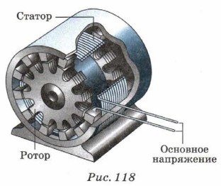 Если говорят, что напряжение в осветительных сетях 220 В или 127 В, то имеют в виду действующее значение напряжения. 5. Устройство генераторов переменного тока, которые используются в промышленности, достаточно сложно. Поскольку с клемм генератора снимают высокое напряжение, то используют не один виток, а значительное их число, и определённым образом соединяют между собой. Кроме того, в генераторах переменного тока обмотка, в которой индуцируется переменное напряжение, устанавливается неподвижно, а магниты, которые создают магнитное поле, вращаются (рис. 118).