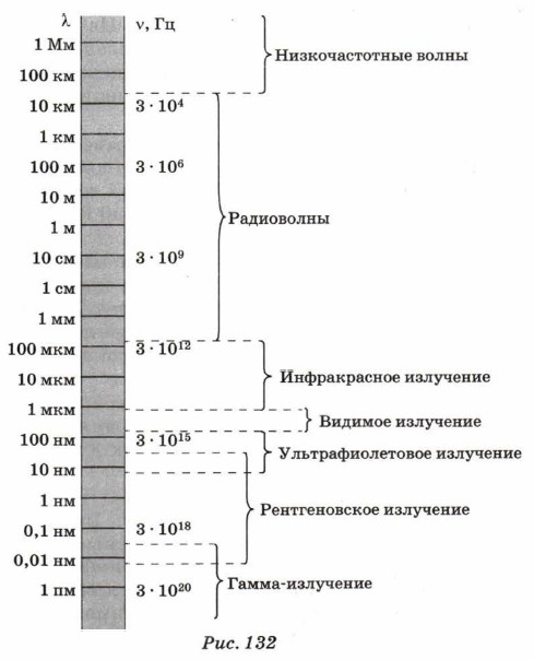 Глава 3. Электромагнитные колебания и волны § 43. Шкала электромагнитных волнПо каким физическим характеристикам различаются световые волны, соответствующие разным цветам? Как связаны длина волны и частота колебаний? 1. Электрически заряженные частицы могут колебаться с различной частотой. Соответственно излучаемые при этом электромагнитные волны имеют разную длину волны. Поэтому диапазон частот электромагнитных волн очень широк: он лежит в пределах от 0 до 3 • 1022 Гц, а длина волны — в пределах от 10-14 м до бесконечности. По длине волны или частоте электромагнитные волны можно разделить на семь диапазонов, границы которых весьма условны, поэтому соседние диапазоны в большинстве случаев перекрывают друг друга. На рисунке 132 приведена шкала электромагнитных волн с указанием частот и длин волн соответствующих диапазонов. Обладая рядом общих свойств, волны разной частоты имеют и специфические свойства. Охарактеризуем их.