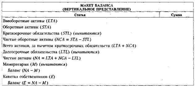 В таблице приведен укрупненный формат баланса в горизонтальном представлении, Соответствующее ему балансовое уравнение является основным, например, в британском учете. Используется вертикальное представление баланса, а ключевые статьи, определяющие его структуру, имеют следующий вид.