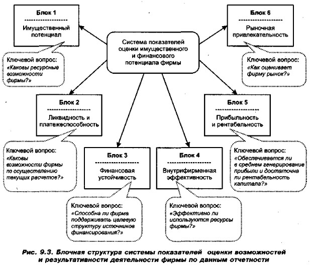 Углубленный анализ. Если экспресс-анализ по сути сводится лишь к чтению годового отчета, то углубленный анализ предполагает расчет системы аналитических коэффициентов, позволяющей получить представление о шести аспектах деятельности предприятия (рис. 9.3). В основе схемы понятие экономического потенциала фирмы как совокупности ее имущественного и финансового потенциалов. Соответственно, под имущественным потенциалом фирмы понимается совокупность ресурсов, находящихся под ее контролем и предназначенных для достижения поставленных перед нею целей, а под финансовым потенциалом — финансовое состояние фирмы и ее финансовые возможности. Представленные на рис. 9.3 блоки показателей описывают потенциальные возможности фирмы и их изменение во времени как результат целенаправленной деятельности.