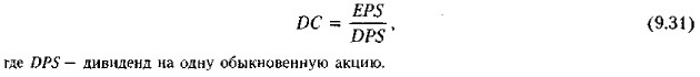 Коэффициент Р/Е служит индикатором спроса на акции данной компании, поскольку показывает, как много согласны платить инвесторы в данный момент за один рубль прибыли на акцию. Относительно высокий рост этого показателя указывает на то, что инвесторы ожидают более быстрого роста прибыли данной фирмы по сравнению с другими. Этот показатель уже можно использовать в пространственных (межхозяйственных) сопоставлениях. Для компаний, имеющих относительно высокое значение коэффициента устойчивости экономического роста, характерно, как правило, и высокое значение показателя Р/Е. Дивидендная доходность акции (Dividend Yield) выражается отношением дивиденда, выплачиваемого по акции, к ее рыночной цене. В компаниях, расширяющих свою деятельность путем капитализирования большей части прибыли, значение этого показателя относительно невелико. Дивидендная доходность акции характеризует процент возврата на капитал, вложенный в акции фирмы. Это прямой эффект. Есть еще и косвенный (доход или убыток), выражающийся в изменении цены на акции данной фирмы и характеризующийся показателем капитализированной доходности. Дивидендный выход (Dividend Payout) рассчитывается путем деления дивиденда, выплачиваемого по акции, на прибыль на акцию. Наиболее наглядное толкование этого показателя — доля чистой прибыли, выплаченная акционерам в виде дивидендов. Значение коэффициента зависит от инвестиционной политики фирмы. С этим показателем тесно связан коэффициент реинвестирования прибыли, характеризующий ее долю на развитие производственной деятельности. Сумма значений показателя дивидендного выхода и коэффициента реинвестирования прибыли равна 1. Дивидендное покрытие (Dividend Cover, DC) — это соотношение между прибылью на обыкновенную акцию и дивидендом, но ней выплачиваемым.