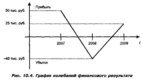 Для того чтобы понять, насколько важен такой анализ и к каким последствиям могут привести компанию колебания финансового результата, смоделируем некоторую ситуацию. Для лизинговой компании при осуществлении серии взаимопе- ресекающихся (во времени) лизинговых проектов часто свойственны как погодо- вые, так и внутригодовые колебания финансового результата, что приводит к излишней уплате налога на прибыль ввиду отсутствия возможности взаимозачета финансовых результатов при расчете налога. Имея в виду данное обстоятельство, предположим, что некая компания в течение 3 лет по совокупности реализуемых ею проектов генерирует следующий финансовый результат: 2007 г, — прибыль в размере 50 тыс. руб.; 2008 г. — убыток в размере 40 тыс. руб.; 2009 г. — прибыль в размере 25 тыс. руб. На рис. 10.4 приведен график колебания финансового результата.