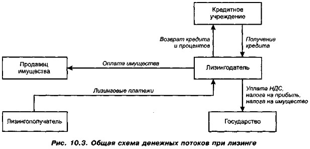 Планирование в системе управления финансами фирмы Учет специфики деятельности фирмы при составлении финансового плана (на примере лизинговой компании)Раздел написан д. э. н. Вит. В. Ковалевым. Рассмотренная в предыдущем разделе типовая система бюджетов имеет отношение, в основном, к фирме, занятой производством и продажей некоторой продукции (товаров). Построение генерального бюджета хоть и является довольно утомительной процедурой, однако в сущностном плане, т. е. с позиции понимания логики ее осуществления, принципиальных трудностей нет. Конечно, каждый из приведенных бюджетов может быть построен с той или иной степенью точности, но то, что эта процедура может быть реализована, не вызывает сомнения. Однако все многообразие бизнеса нельзя унифицировать, а потому очевидно, что финансовое планирование, в том числе бюджетирование, может иметь специфику, определяемую отраслевыми факторами, объемом операций, управленческой культурой идр. Финансовое планирование не следует трактовать как набор стандартных, заранее предопределенных действий, например, по построению операционного и финансового бюджетов. Для иллюстрации сказанного рассмотрим один из возможных и весьма эффективных подходов к построению бюджета лизинговой компании, специфика деятельности которой (например, жесткая предопределенность и стандартизован- ность операций фирмы, заключающаяся в сдаче в аренду активов, отсутствие крупных управленческих и коммерческих расходов, унифицированность коммерческих договоров, возможность точного прогноза выручки в долгосрочном аспекте н др.) позволяет оптимизировать его с помощью системы двойной записи. (Будет изложена лишь логика оптимизации; числовой пример построения оптимизированных бюджетов можно найти в работе | Ковалев Вит. В.].) Одним из ключевых аспектов регулирования деятельности любого хозяйствующего субъекта является планирование потоков денежных средств. Фирма представляет собой совокупность упорядоченных денежных потоков, а искусство финансового планирования заключается в согласовании притоков и оттоков. С одной стороны, излишне аккумулированные, неработающие денежные средства омертвляются, т. е. используются нерационально; с другой стороны, крупные имущественные приобретения могут быть сделаны лишь в том случае, если накоплены соответствующие деньги. Кроме того, в любой фирме стараются согласовать встречные потоки но той простой причине, что поступившие от дебиторов средства с небольшим лагом используются для расчетов со своими кредиторами. Нарушение платежно-расчетной дисциплины дебиторами может иметь каскадный эффект и привести к существенным и долговременным сбоям в выполнении собственных обязательств перед лендерами и кредиторами. Любое планирование программ инвестиционного характера предполагает прежде всего оценку графика поступления денежных средств и возможностей их использования для инвестирования. Именно поэтому рассмотрение техники бюджетирования в лизинговой компании мы начнем с планирования денежных потоков. В общем виде денежные потоки могут быть представлены схемой (рис. 10.3). Лизинговая сделка состоит из нескольких последовательных операций. Нуждающийся в некотором имуществе лизингополучатель, предпочитающий в силу ряда обстоятельств приобрести это имущест
