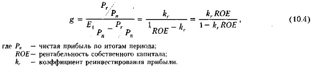 Экономический смысл показателя g понятен: это темп прироста собственного капитала фирмы, т. е. богатства ее собственников, что является доминирующей целью функционирования фирмы с позиции ее собственников как абстрактных инвесторов. Не изымая наработанную прибыль из фирмы, а оставляя ее реинвестированной, собственники как бы подтверждают эффективность вложений в фирму и не считают для себя целесообразным озаботиться поиском альтернативных вариантов инвестирования. Путем деления числителя и знаменателя на показатель чистой прибыли, полученной фирмой в отчетном периоде, можно преобразовать формулу (10.3) к довольно распространенному в аналитических кругах виду: