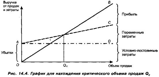 Приведенная формула является одной из базовых в системе внутрифирменного анализа и может использоваться как в ретроспективном анализе, так и в планово-аналитической работе. При планировании, задавая значения исходных факторов (цена, условно-постоя иные и переменные расходы), можно рассчитать минимальный объем производства продукции, необходимый для покрытия расходов, т. е, обеспечивающий безубыточность финансово-хозяйственной деятельности. Графический метод удобен для иллюстрации зависимости между показателями, участвующими в расчете точки безубыточности аналитическим методом. Графическое изображение модели, характеризующее логику взаимосвязи показателей, формирующих значение критического объема продаж, приведено на рис. 14.4.