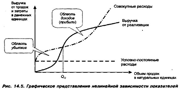 Сплошная линия ОВ отражает изменение выручки от продаж; здесь имеет место прямая зависимость: с ростом объема проданной продукции растет и величина выручки. Штрих-пунктирная линия AD отражает изменение условно-постоянных затрат; поскольку считается, что эти затраты не зависят от объема продаж, линия параллельна осн абсцисс. Штриховая линия АС отражает изменение совокупных затрат как суммы переменных и у словно-постоянных затрат. Точка пересечения линий ОВ и АС определяет тот объем продаж Подчеркнем, что не следует абсолютизировать выводы, к которым можно придти, анализируя график. Во-первых, приведенное графическое представление взаимосвязи выручки и расходов от объема выпуска продукции основано на условном предположении об их прямо пропорциональной зависимости. Многочисленные исследования показали, что зависимость носит нелинейный характер, поэтому график может выглядеть иначе (рис. 14.5).