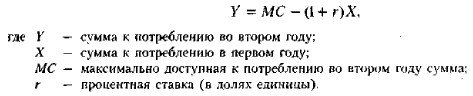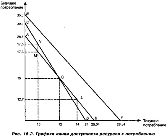 Допустим, что инвестор решил снизить свои потребности первого года, уменьшив их на 2 тыс. долл, от максимально возможного. В этом случае потребление первого года составит 10 тыс. долл.; потребление второго года составит 17.3 тыс. долл. (15 + 2 • 1,15 = 17,3). Общая сумма потребления равна 27,3 тыс. долл. Этому варианту соответствует точка М на линии АВ с координатами (10; 17,3). Допустим, что инвестору по некоторым причинам понадобилось увеличить на 2 тыс. долл, максимально возможное потребление первого года. В этом случае понадобится банковский кредит, по которому придется рассчитаться из доходов второго года. Итак, потребление первого года равно 14 тые. долл.; потребление второго года равно 12,7 тыс. долл. (15 - 2 • 1,15 = 12,7), Общая сумма потребления составит 26,7 тыс. долл. Этому варианту также соответствует некоторая точка L на линии АВ. Точка О на графике является центральной и соответствует базовому варианту, когда в пределах каждого периода суммы потребления и дохода совпадают. Движение по прямой от О в сторону А означает предоставление кредита; движение от О в сторону В означает получение кредита. Очевидно, что представленная зависимость описывается формулой