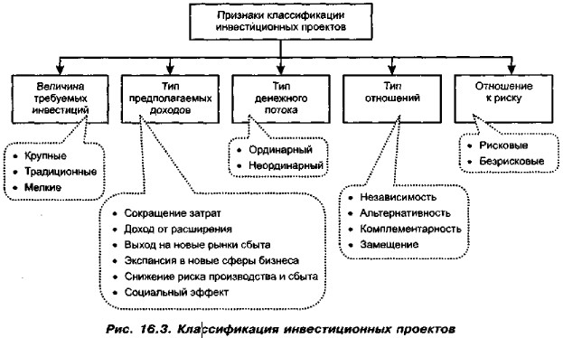Управление инвестиционной деятельностью фирмы Классификация инвестиционных проектов (продолжение)Нередко решения должны приниматься в условиях, когда имеется ряд альтернативных или взаимно независимых проектов, т, е. возникает необходимость сделать выбор одного или нескольких проектов, основываясь на каких-то формализованных критериях. Очевидно, что таких критериев может быть несколько, а вероятность того, что какой-то проект будет предпочтительнее других по всем критериям, как правило, значительно меньше единицы. В этом случае приходится отдавать приоритет одному критерию, устанавливать их иерархию или использовать дополнительные неформализованные методы оценки. В условиях рыночной экономики возможностей для инвестирования довольно много. Вместе с тем любая коммерческая организация имеет ограниченное количество свободных финансовых ресурсов, доступных для инвестирования. Поэтому всегда актуальна задача оптимизации инвестиционного портфеля. Как уже упоминалось, весьма существен фактор риска. Инвестиционная деятельность, во-первых, всегда связана с иммобилизацией финансовых ресурсов компании и, во-вторых, обычно осуществляется в условиях неопределенности, степень которой может значительно варьировать. Так, в момент приобретения основных средств никогда нельзя точно предсказать экономический эффект этой операции. Поэтому нередко решения принимаются интуитивно. Ошибочный прогноз в отношении приобретения того или иного объема активов может иметь неприятные последствия двух типов: ошибка в инвестировании в сторону занижения приведет к неполучению возможного дохода; излишнее инвестирование приведет к неполной загрузке мощностей. Эффективность капиталовложений включает также своевременность и разумное качество требуемых основных средств. В определенной степени это достигается разработкой детализированного плана-графика для фазы инвестирования. Принятие решений инвестиционного характера, как и любой другой вид управленческой деятельности, основывается на использовании формализованных и неформализованных методов и критериев. Их сочетание определяется разными обстоятельствами, в том числе насколько менеджер знаком с аппаратом, применимым в том или ином случае. В отечественной и зарубежной практике известен целый ряд формализованных методов; результаты расчетов, полученные с их помощью, могут служить основой для принятия решений в области инвестиционной политики. Универсального метода, пригодного для всех случаев жизни, не существует. Тем не менее, имея некоторые оценки, полученные формализованными методами. пусть даже условные, легче принимать решения. С позиции управленческого персонала компании, инвестиционные проекты могут быть классифицированы по различным основаниям (рис. 16.3). Безусловно, характеристики не являются абсолютными. В частности, разделение по объему требуемых инвестиций чаще всего зависит от размера компании, поскольку очевидно, что в солидной финансово-промышленной группе и небольшом заводе по производству мебели используемые критерии отнесения анализируемого проекта к крупному или мелкому существенно разнятся.