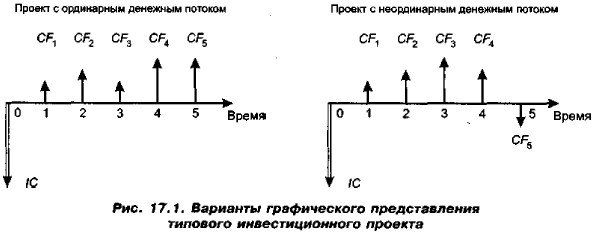 Критерии оценки инвестиционных проектов Вводные замечания (окончание)Весьма наглядным инструментом в анализе инвестиционных проектов в сфере реальных инвестиций является графическое представление соответствующего денежного потока (рис. 17.1). Стрелка, направленная вверх, характеризует приток денежных средств; стрелка, направленная вниз, — их отток. С формальной точки зрения, любой инвестиционный проект зависит от ряда параметров, которые подлежат оценке и нередко задаются в виде дискретного распределения, что позволяет проводить этот анализ как имитационное моделирование.