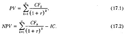 Критерии оценки инвестиционных проектов Метод расчета чистой дисконтированной стоимостиПод чистой дисконтированной стоимостью (Net Present Value, NPV) понимается разность суммы элементов возвратного потока и исходной инвестиции, дисконтированных к началу действия оцениваемого проекта. Критерий принимает во внимание временную ценность денежных средств. В основу данного метода оценки заложено следование основной целевой установке, определяемой собственниками компании, — повышение ценности фирмы, количественной оценкой которой служит ее рыночная стоимость. Соответственно целесообразность принятия проекта зависит от того, будет ли иметь место приращение ценности фирмы в результате реализации проекта. Поскольку принятие решений по инвестиционным проектам чаще всего инициируется и всегда осуществляется не собственниками компании, а ее управленческим персоналом, молчаливо предполагается, что цели собственников и высшего управленческого персонала конгруэнтны, т, е. негативные последствия возможного агентского конфликта не учитываются. Метод основан на сопоставлении величины исходной инвестиции (IC) с общей суммой дисконтированных чистых денежных поступлений, генерируемых ею в течение прогнозируемого срока. Поскольку приток денежных средств распределен во времени, он дисконтируется с помощью ставки г, устанавливаемой аналитиком (инвестором) самостоятельно, исходя из ежегодного процента возврата, который он хочет или может иметь на инвестируемый им капитал. Пусть делается прогноз, что инвестиция (IC) будет генерировать в течение п лет годовые доходы в размере CF1, CF2,..., CFn. Общая накопленная величина дисконтированных доходов (Present Value, PV) и чистая дисконтированная стоимость (NPV) соответственно рассчитываются по следующим формулам (следствие DСF - модели для данного вида задачи):