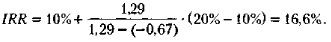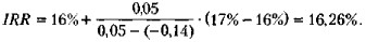 Можно уточнить полученное значение. Допустим, что путем нескольких итераций мы определили ближайшие целые значения ставки дисконтирования, при которых NPV меняет знак: при r =16% NPV = +0,05; при r = 17% NPV = -0,14. Тогда уточненное значение IRR будет равно