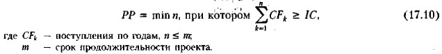 Критерии оценки инвестиционных проектов Метод определения срока окупаемости инвестицийСрок окупаемости инвестиции (Payback Period, РР) применяется для оценки инвестиционных проектов и предусматривает расчет числа базисных периодов, за которое произойдет возмещение сделанных инвестиционных расходов без учета фактора времени. Этот метод, являющийся одним из самых простых и широко распространенных в мировой учетно-аналитической практике, не предполагает временной упорядоченности денежных поступлений. Алгоритм расчета зависит от равномерности распределения прогнозируемых доходов от инвестиции. Если доход распределен по годам равномерно, то срок окупаемости рассчитывается делением единовременных затрат на величину годового дохода, обусловленного ими. При получении дробного числа оно округляется в сторону увеличения. Если прибыль распределена неравномерно, то срок окупаемости рассчитывается прямым подсчетом числа лет, в течение которых инвестиция будет погашена кумулятивным доходом. Общая формула расчета показателя РР имеет вид