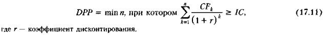 Нередко показатель РР рассчитывается более точно, т. е. рассматривается дробная часть года; при этом делается молчаливое предположение о том, что денежные потоки распределены равномерно в течение каждого года. Так, для проекта с денежным потоком (млн руб.)-100 40 40 40 30 20 значение показателя РР равно 3 годам, если расчет ведется с точностью до целого года, или 2,5 года — в случае точного расчета. Одним из недостатков критерия РР является игнорирование им фактора времени. Для преодоления этого недостатка разработали модификацию показателя РР, известную как дисконтированный срок окупаемости инвестиции (Discounted Payback Period, DPP) и предусматривающий расчет числа базисных периодов, за которое произойдет возмещение сделанных инвестиционных расходов с учетом фактора времени. Соответствующая расчетная формула, построенная на базе DCF-модели, имеет вид