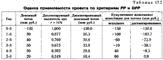 Из приведенных в табл, 17.2 расчетов видно, что РР = 4 года (при точном расчете РР = 3,25 года), a DPP = 5 лет (при точном расчете DPP - 4,9 года). Таким образом, если решение принимается на основе обыкновенного срока окупаемости, то проект приемлем, если используется критерий дисконтированного срока окупаемости, то проект скорее всего будет отвергнут.