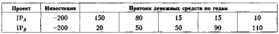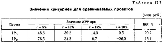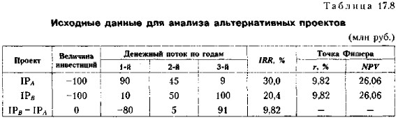 Из приведенных расчетов видно, что проекты IРA и IPB не одинаково реагируют на изменение ставки дисконтирования. Действительно, при переходе от 10% к 15% NPV проекта IPB снижается на 98%, тогда как NPV проекта IPA снижается на 52,6%, Понятна причина такой неодинаковости. Проект IРA имеет убывающий денежный поток, а проект IPB — нарастающий. Поскольку интенсивность возмещения инвестиции в проекте IРA существенно выше, чем в проекте IPB, он в меньшей степени реагирует на негативное увеличение значения ставки дисконтирования. Что касается проектов типа IPB, то они являются более рисковыми, о чем, кстати, можно судить и по значению IRR. Именно в отношении подобных проектов оценка должна выполняться в режиме имитационного анализа, подразумевающего учет поправки на риск. 4. Для проектов классического характера критерий IRR показывает лишь максимальный уровень затрат, который может быть ассоциирован с оцениваемым проектом. В частности, если стоимость инвестиций в оба альтернативных проекта меньше, чем значения IRR для них, выбор может быть сделан лишь с помощью дополнительных критериев. Более того, критерий IRR не позволяет различать ситуации, когда стоимость капитала меняется. Рассмотрим пример. Пример В табл. 17.8 приведены исходные данные по двум альтернативным проектам. Требуется выбрать один из них при условии, что стоимость капитала, предназначенного для инвестирования проекта: (а) 8%; (б) 15%.