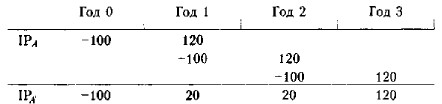 Методы обоснования реальных инвестиций Сравнительный анализ проектов разной продолжительностиВ практике вполне вероятна ситуация, когда необходимо сравнивать проекты разной продолжительности. Речь может идти как о независимых, так и об альтернативных проектах. В частности, сравнение независимых проектов может иметь место, когда заранее не известен объем доступных источников финансирования. В этом случае проводится ранжирование проектов по их приоритетности, т. е. по мере появления финансовых возможностей проекты последовательно принимаются к внедрению. Рассмотрим следующую ситуацию. Имеется два независимых проекта со следующими характеристиками (млн руб.): IPA: -100 120 IРB: -50 30 40 15. Требуется ранжировать их по степени приоритетности, если стоимость капитала 10%. Значения NPV при СС = 10% и IRR для этих проектов соответственно равны IPA: NPV = 9,1 млн руб., IRR = 20%; IРB: NPV = 21,6 млн руб., IRR = 35,4%. На первый взгляд, по всем параметрам проект IРB более предпочтителен. Однако насколько правомочен такой вывод? Сразу же бросается в глаза временная несопоставимость проектов: первый рассчитан на один год, второй — на 3 года. Сравнивая проекты по критерию NPV, мы как бы выравниваем их по продолжительности, неявно предполагая, что притоки денежных средств по проекту IРA во втором и третьем годах равны нулю. В принципе, такое предположение нельзя считать неправомочным, однако возможна и другая последовательность рассуждений. Попробуем устранить временную несопоставимость проектов путем повтора реализации более короткого из них. Предположим, что проект IРA может быть реализован последовательно несколько раз, т. е. как только заканчивается k-я реализация проекта, вводится в действие (k + 1)-я реализация. Каждая реализация обеспечит свой доход, а их сумма (в данном случае за три реализации) с учетом фактора времени, характеризующая изменение благосостояния владельцев вследствие принятия проекта, уже сопоставима с NPV проекта IРB. Такая логика представляется вполне разумной, поскольку позволяет устранить негативное влияние временного фактора ввиду разной продолжительности проектов. Следуя данной логике, мы переходим от проекта IРA к некоторому условному проекту IРA, продолжающемуся 3 года и имеющему следующий вид: