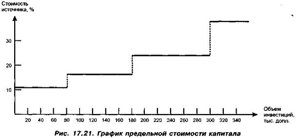 График МСС как раз и показывает зависимость между объемом финансирования и стоимостью капитала (обычно речь идет о WACC, но можно строить эту зависимость и в отношении только заемного капитала). Изменение графика идет скачкообразно (см. рис. 17.21).