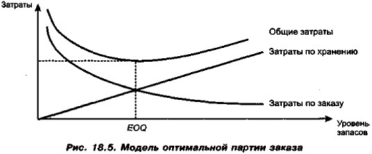 Итак, оба компонента общих затрат, связанных с поддержанием запасов, изменяются обратно пропорционально друг другу, поэтому можно найти такую величину среднего запаса, которой соответствует минимальный уровень этих затрат. Легче всего логику выявления оптимальной партии заказа представить графически (рис. 18.5).