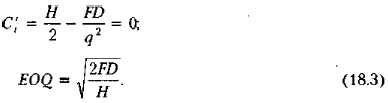 График функции общих затрат имеет вид параболы; поэтому, дифференцируя по q и приравнивая к нулю первую производную, можно найти такое значение q, при котором функция достигает своего минимума, т. е. суммарные затраты по управлению запасами минимизируются. Соответствующая величина запаса носит название оптимальной партии заказа (Economic Order Quantity, EOQ), а формула расчета имеет вид