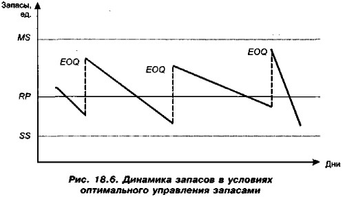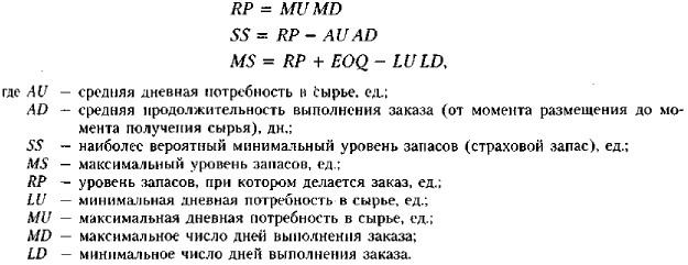 Политика управления заказами в этом случае такова. На основе статистики и экспертных оценок рассчитывают значения исходных факторов системы моделей. Как только уровень запасов опускается до величины RP или ниже, делают заказ на поставку сырья и материалов. Если поставка осуществляется максимально эффективно, то уровень запасов в компании может достичь максимальной величины MS. Если после совершения заказа ежедневное потребления сырья и материалов достигло максимума и по каким-либо причинам поставка очередной партии затянулась, компании приходится воспользоваться страховым запасом, т. е. уровень запасов может опуститься ниже величины SS, а при самых неблагоприятных условиях он может быть близким к нулю.